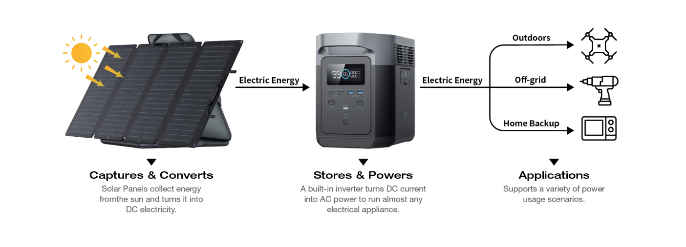Depois de coletar e armazenar energia CC (corrente direta), o gerador solar converte a eletricidade CC em CA (corrente alternada) para conseguir alimentar aparelhos elétricos em ambientes internos e externos.