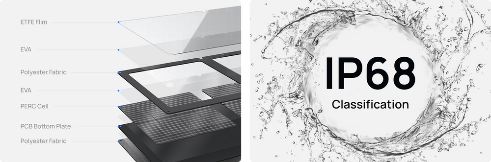 Nosso painel solar portátil de 60 W foi construído para suportar toda uma variedade de ambientes, desde úmidos e molhados até secos e empoeirados. Com uma elevada classificação à prova de água IP68 e uma película protetora de ETFE, as células solares continuam a captar energia mesmo durante chuvas torrenciais.