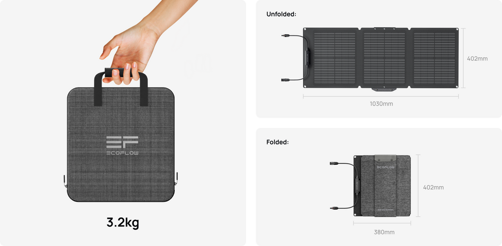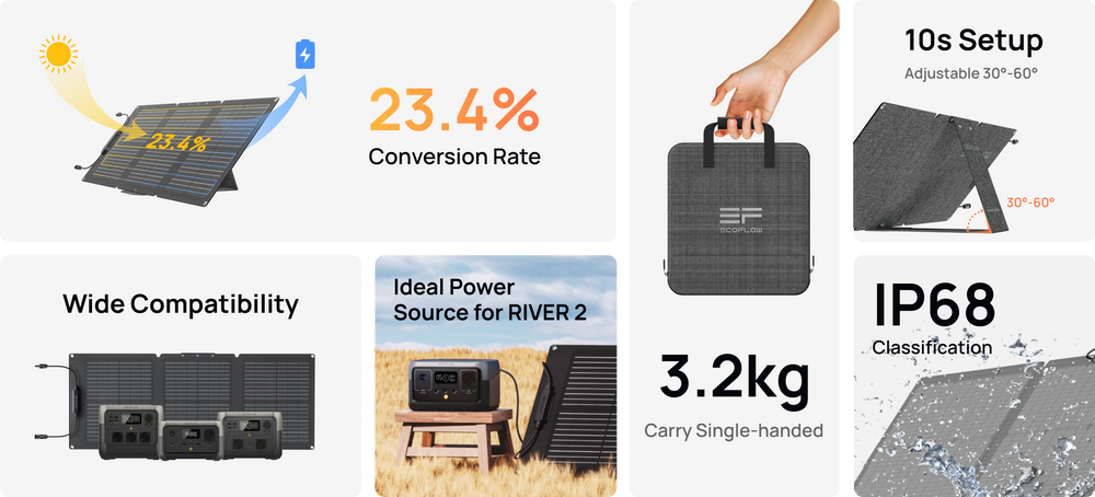 O gerador solar RIVER 2 da EcoFlow é essencial para acampamentos ou viagens de RV. Nosso novo painel solar portátil de 60 W é a opção mais leve e conveniente disponível. Pesando apenas 3,2 kg e com um design dobrável, ele é fácil de pegar e levar a qualquer momento.