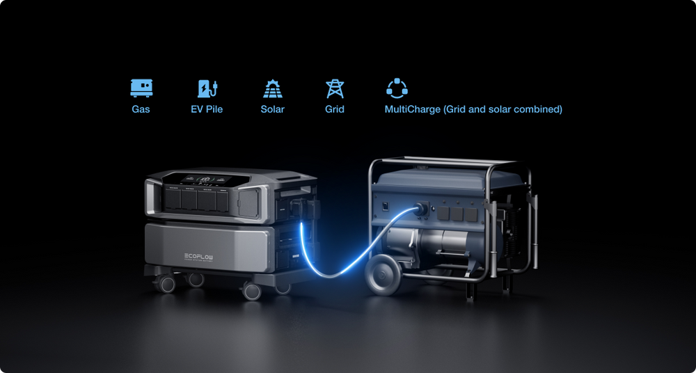 Você não terá mais escolha com as opções de carregamento do EcoFlow DELTA Pro Ultra. Além de todos os nossos métodos habituais, como a energia solar e a rede, agora você pode carregar usando um gerador de gás ou até mesmo sua estação de carregamento de veículos elétricos. Com as velocidades de carregamento mais rápidas do setor, de 8.800 W, você pode carregar duas baterias em apenas 2 horas.