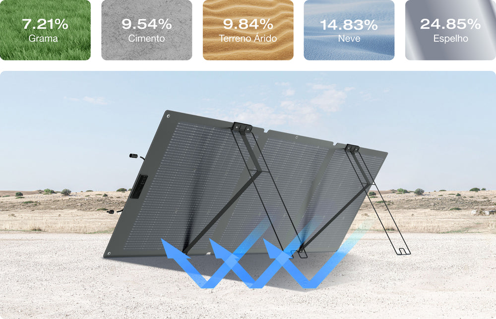Com um lado primário de 160 W e um lado traseiro de 125 W para luz ambiente, você pode capturar até 28% mais energia solar e carregar sua estação de energia portátil ainda mais rápido.