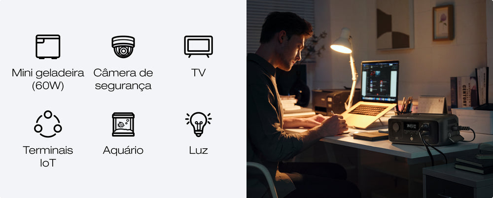Quando ocorrer uma queda de energia, sua tomada CA mudará para a fonte RIVER 3 em 20 ms quase imperceptíveis. Ela mantém os dispositivos domésticos vitais em funcionamento, mantendo o armazenamento de alimentos, a segurança e a comunicação. Experimente uma troca automática e sem interrupções para garantir tranquilidade contínua