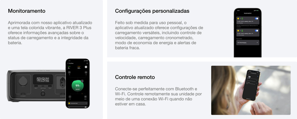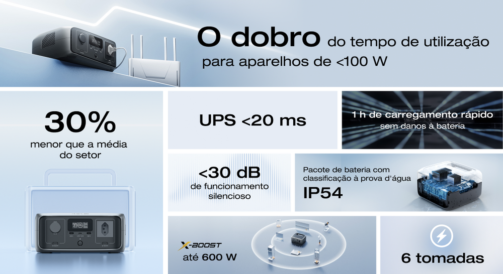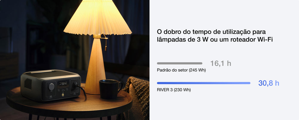 A RIVER 3 revoluciona a eficiência energética, oferecendo o dobro de tempo de operação para aparelhos abaixo de 100 W, ampliando o uso tanto em casa quanto ao ar livre.